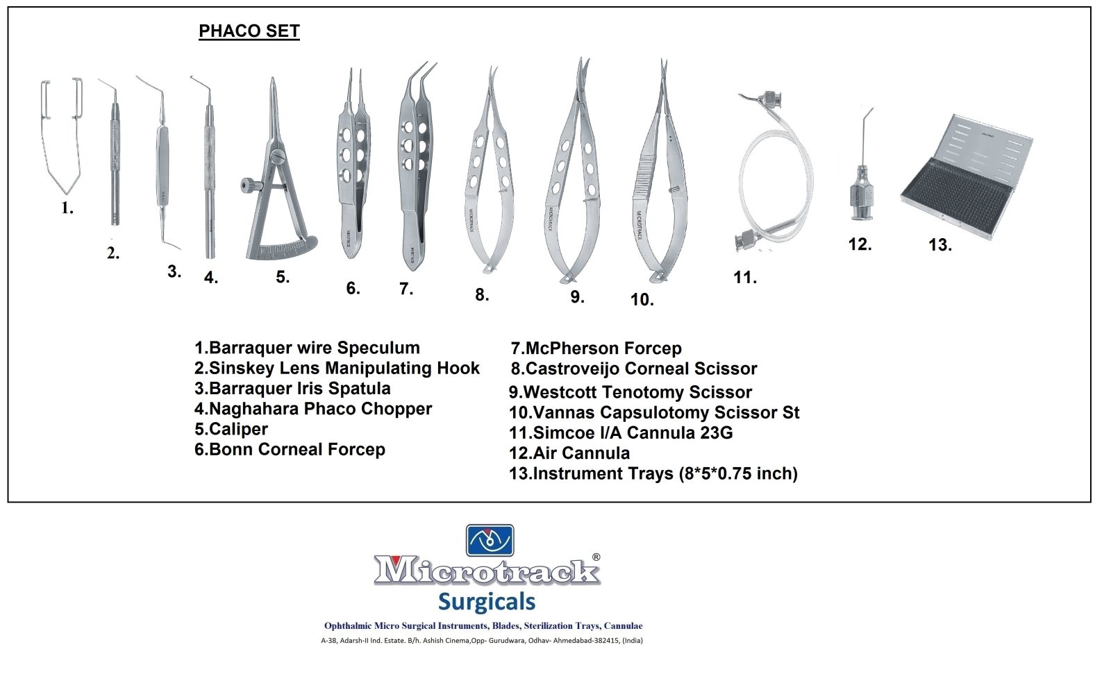 Phaco Instruments Set by Microtrack Surgicals Price US$POA Supplier/s Microtrack Surgicals Supplier Code MKT Phaco Instruments Set Country of Origin India Request a quote Product Description List of Instruments: Barraquer wire Speculum Sinskey Lens Manipulating Hook Barraquer Iris Spatula Naghahara Phaco Chopper Caliper Bonn Corneal Forcep McPherson Forcep Castroveijo Corneal Scissor Westcott Tenotomy Scissor Vannas Capsulotomy Scissor St Simcoe I/A Cannula 23G Air Cannula Instrument Trays (8*5*0.75 inch) Product Features Made from High Quality Stainless Steel / Titanium Material Available in Stainless Steel & Titanium Material Antiglare (Non-Reflecting Surface finish) CE and ISO-13485 Certified Share: